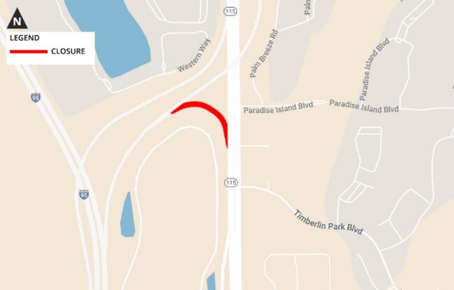 JACKSONVILLE, Fla. – As part of the Martin Luther King Jr. Parkway Intelligent Transportation System (ITS) improvements project on Martin Luther King Jr. Parkway (State Road 115) from Boulevard Street to Beach Boulevard, overnight detours are scheduled Monday, April 29 through Thursday, May 2 for installation of CCTV poles. MLK Parkway Northbound On-Ramp from University Boulevard…