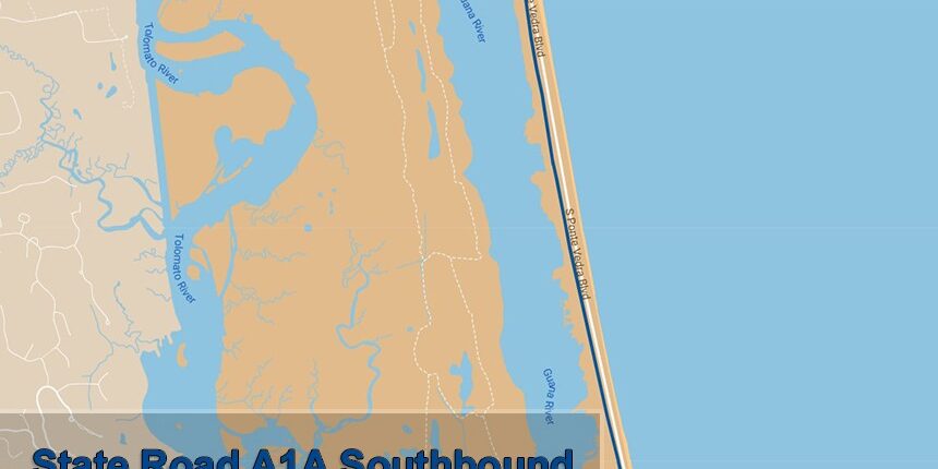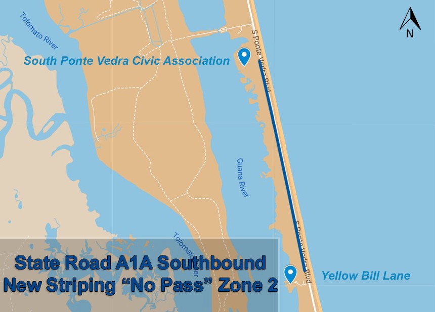 ST. JOHNS COUNTY, Fla. – As part of ongoing efforts of The Florida Department of Transportation (FDOT) to improve safety on State Road A1A, a new “no pass” zone of State Road A1A southbound in South Ponte Vedra Beach has been designated. New striping is scheduled to be installed on State Road A1A southbound between the Guana Tolomato Matanzas South Beach Access and Yellow Bill Lane during the week of Jan. 13, 2025, weather and unforeseen circumstances permitting. Please refer to the maps below for further project limit clarification.