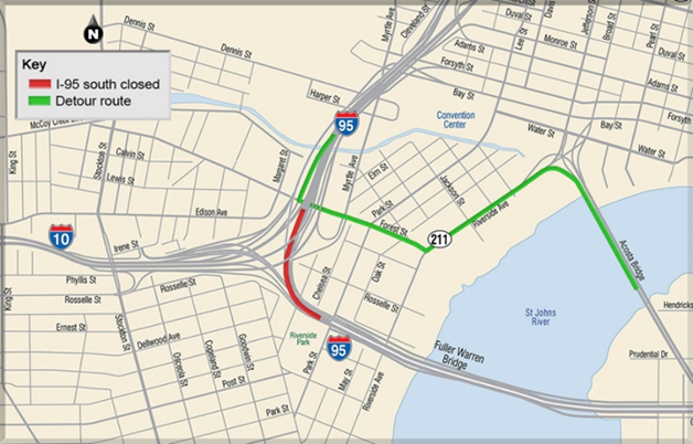 I-95 South Detour: Drivers on I-95 south approaching the Fuller Warren Bridge will detour to the Forest Street exit, left on Forest Street, left on Riverside Avenue and take the Acosta Bridge to rejoin I-95 southbound.