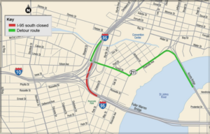 I-10 East Detour: Drivers on I-10 east who wish to access I-95 south will detour north to the Union Street exit and right on Jefferson Street to connect with the Acosta Bridge and rejoin I-95 southbound.