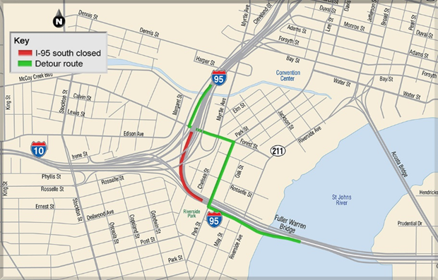 I-95 North Detour: Sunday, July 10 through Tuesday, July 12 from 10:30 p.m. to 5:30 a.m. as well as Saturday, July 16 from 10:30 p.m. to 6:30 a.m., drivers on I-95 north will be detoured to the Acosta Bridge, right on Broad Street and left on Adams Street to reconnect with I-95 north. Drivers who wish to connect with I-10 will take I-95 south to connect with I-10.