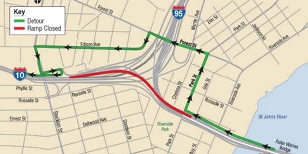 I-95 North Detour: Thursday, July 28 from 10:30 p.m. to 5:30 a.m., as well as Friday, July 29 and Saturday, July 30 from 10:30 p.m. to 6:30 a.m., drivers on I-95 north will be detoured to the Acosta Bridge, right on Broad Street and left on Adams Street to reconnect with I-95 north. Drivers who wish to connect with I-10 will take I-95 south to connect with I-10.