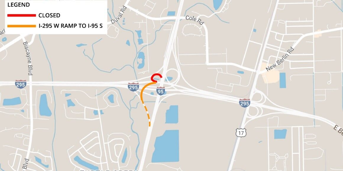 JACKSONVILLE, Fla. – FDOT has relocated the I-295 westbound ramp to I-95 Southbound as part of a new phase of construction on the I-95/I-295 North Interchange project. As shown below in orange, drivers will now exit left from I-295 Westbound to go I-95 Southbound.
