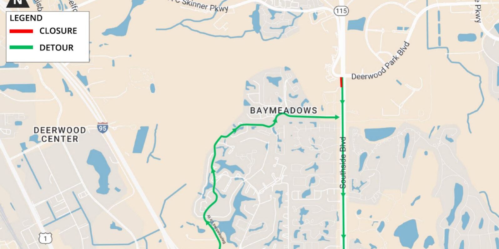 During the closures, drivers on Southside Boulevard southbound who wish to access the service road will continue southbound and use Old Baymeadows Road to Baymeadows Circle West and follow posted detour signs to Southbrook Drive to access the service road as shown in the map below.